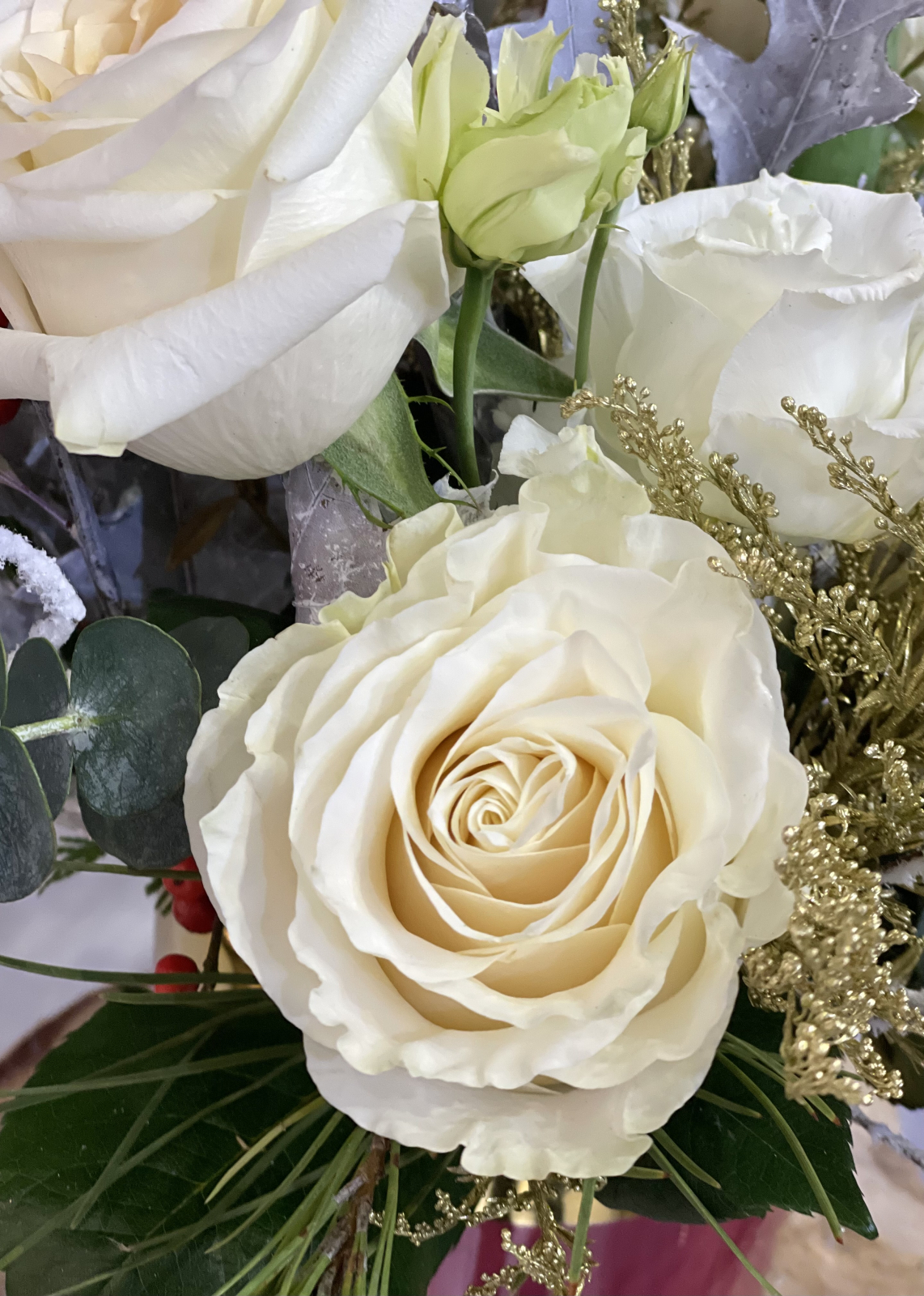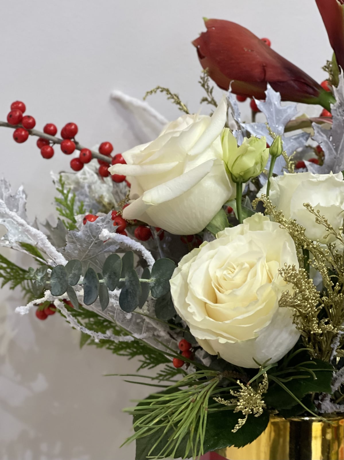Un aranjament de iarna, cu celebrele vedete: amarilis, ilex si trandafiri.