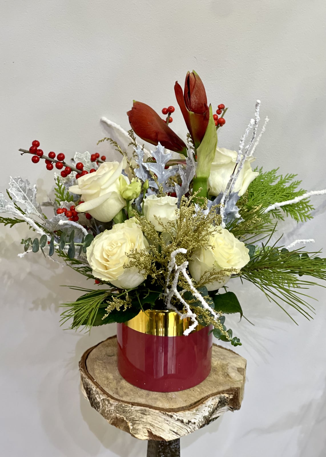 Aranjament de Craciun in vas ceramic cu amarilis, ilex si trandafiri