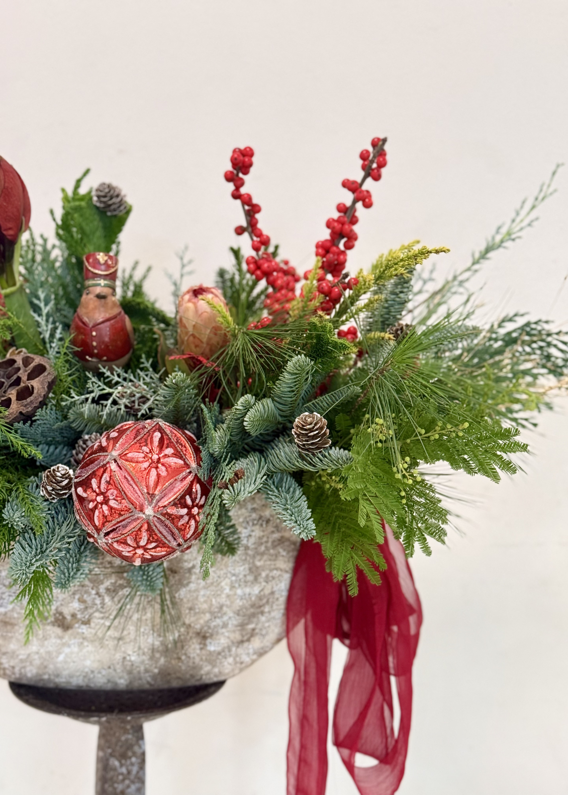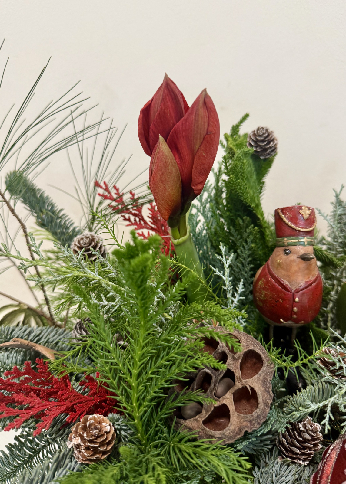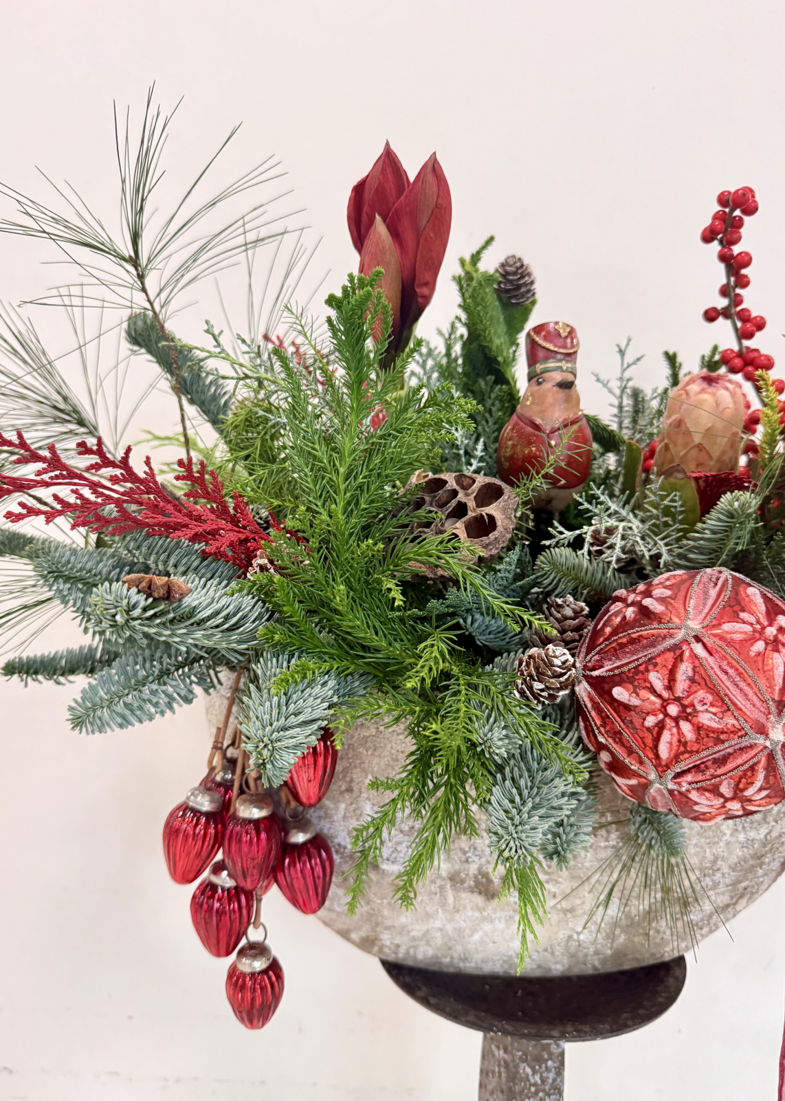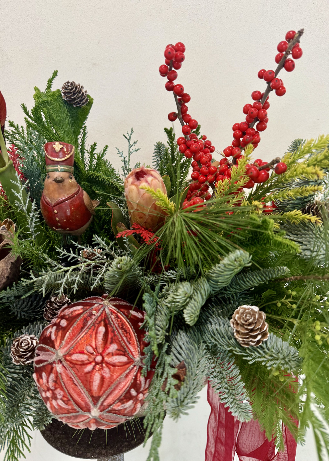 Un aranjament de Craciun impresionant si impunator, din multiple texturi de brad, decorat cu flori rosii (ilex, amaryllis, protea), figurine, globuri si conifere.