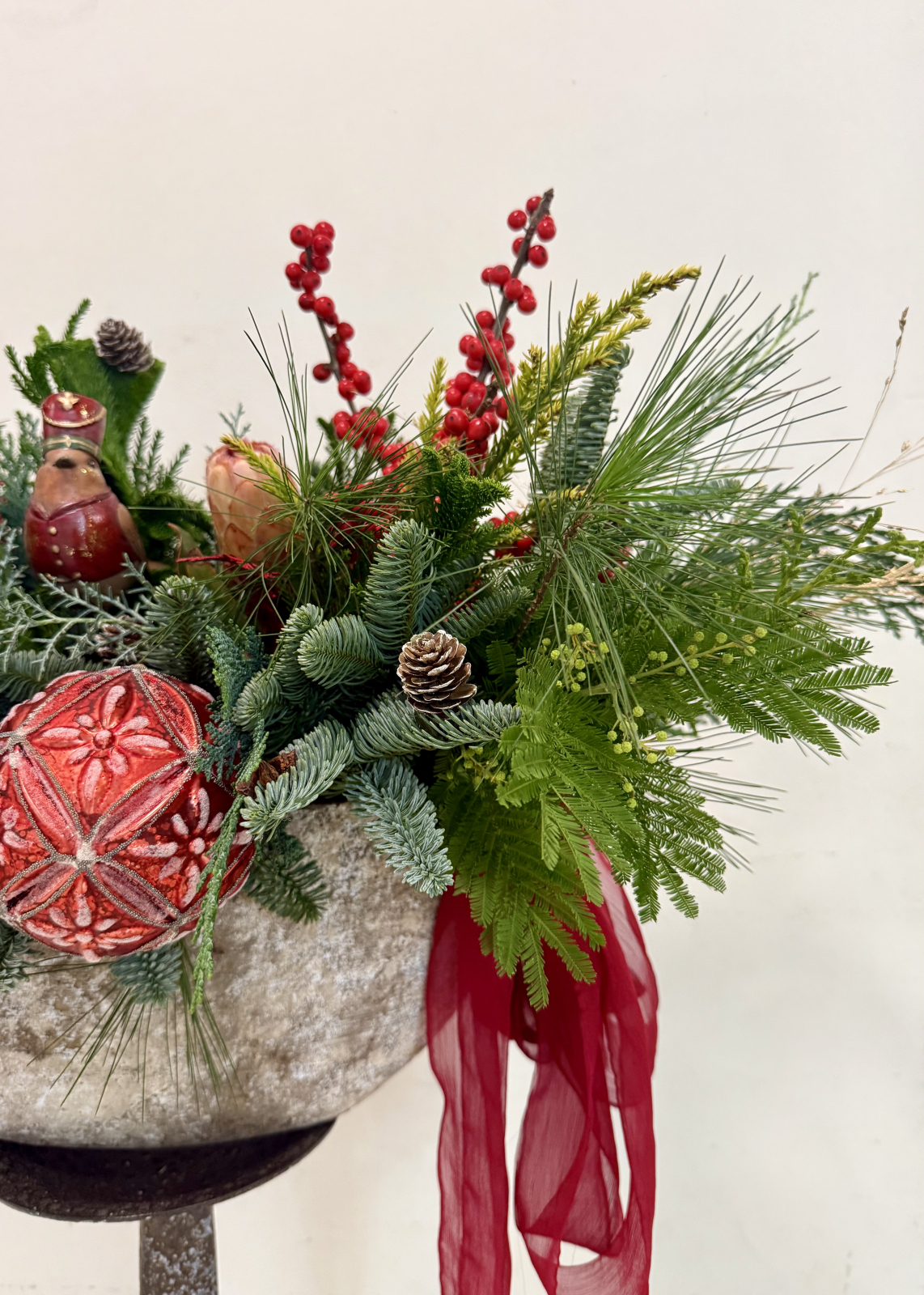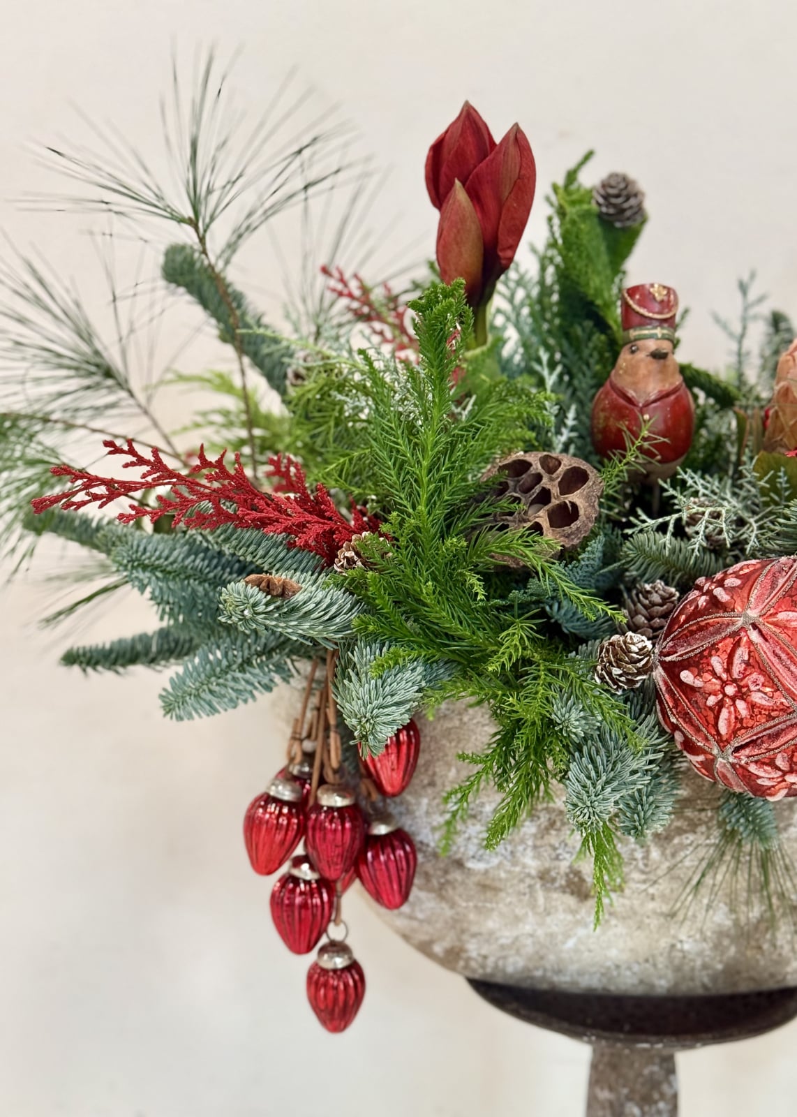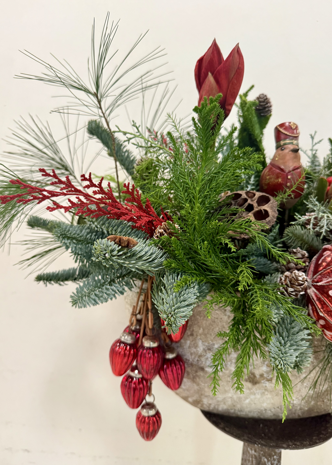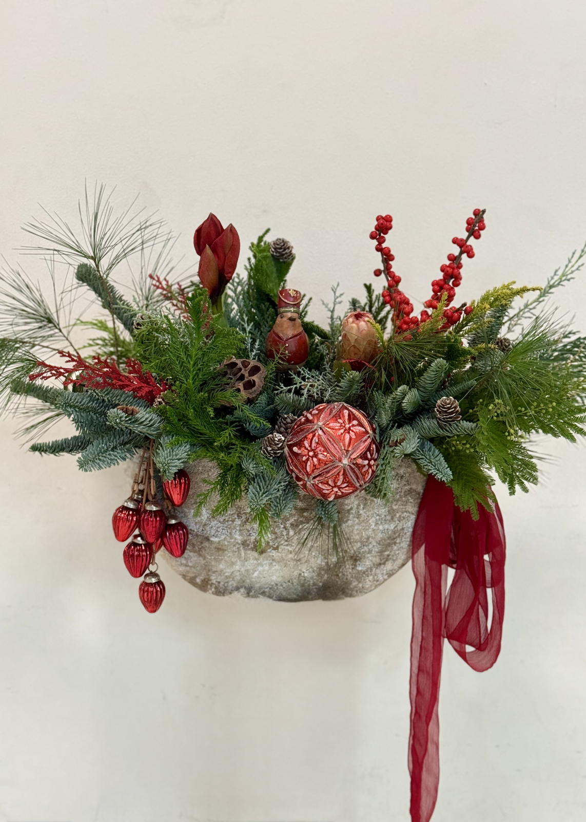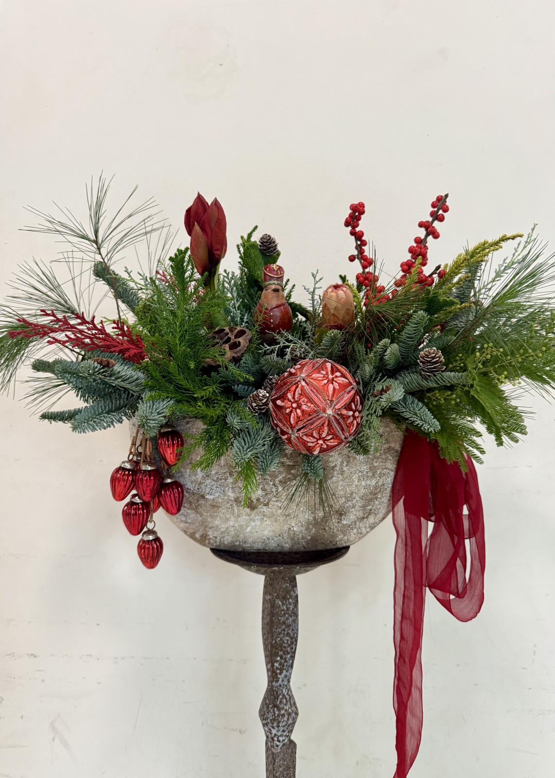 Un aranjament de Craciun impresionant si impunator, din multiple texturi de brad, decorat cu flori rosii (ilex, amaryllis, protea), figurine, globuri si conifere.